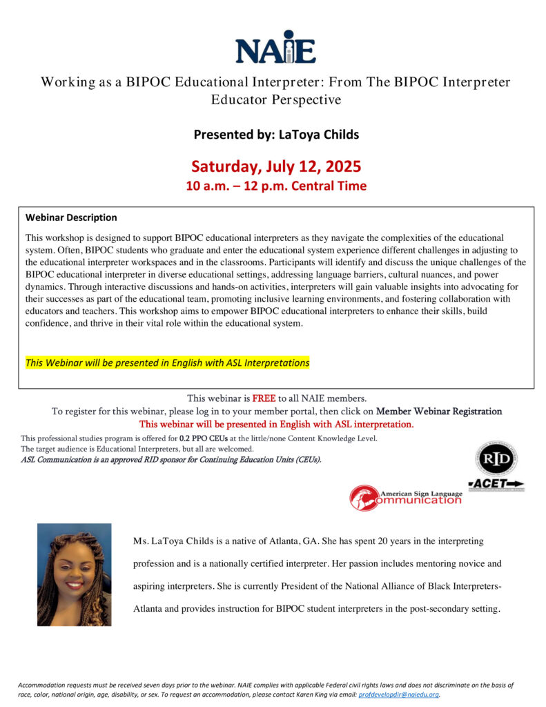 “This workshop is designed to support BIPOC educational interpreters as they navigate the complexities of the educational system. Often, BIPOC students who graduate and enter the educational system experience different challenges in adjusting to the educational interpreter workspaces and in the classrooms. Participants will identify and discuss the unique challenges of the BIPOC educational interpreter in diverse educational settings, addressing language barriers, cultural nuances, and power dynamics. Through interactive discussions and hands-on activities, interpreters will gain valuable insights in advocating for their successes as part of the educational team, promoting inclusive learning environments, and fostering collaboration with educators and teachers. This workshop aims to empower BIPOC educational interpreters to enhance their skills, build confidence, and thrive in their vital role within the educational system.”