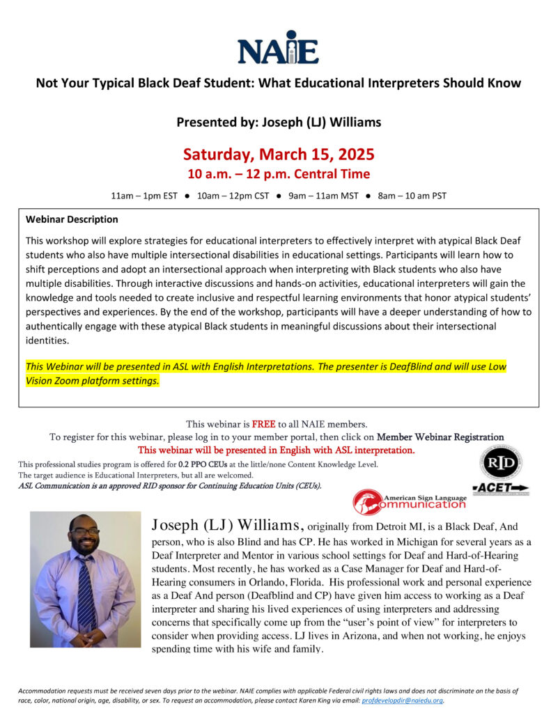 “This workshop will explore strategies for educational interpreters to effectively interpret with atypical Black Deaf students who also have multiple intersectional disabilities in educational settings. Participants will learn how to shift perceptions and adopt an intersectional approach when interpreting with Black students who also have multiple disabilities. Through interactive discussions and hands-on activities, educational interpreters will gain the knowledge and tools needed to create inclusive and respectful learning environments that honor atypical students’ perspectives and experiences. By the end of the workshop, participants will have a deeper understanding of how to authentically engage with these atypical Black students in meaningful discussions about their intersectional identities.”